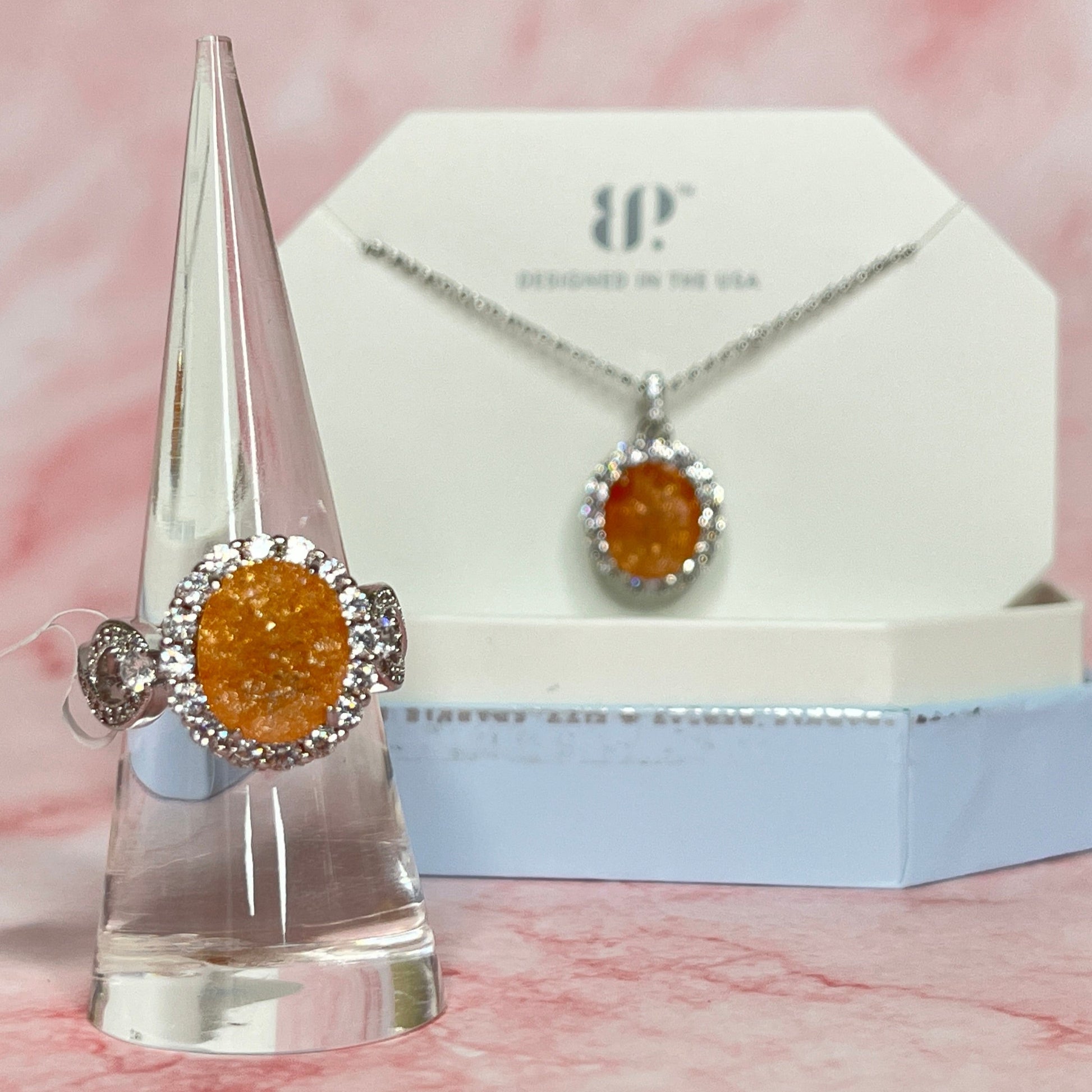 Turn heads with this revealed Peach Ice Crystal set in The 2424 unicorn setting, finished in sleek rhodium plating. Includes a size 7 ring and matching necklace, both glowing with radiant peach ice crystal shine.