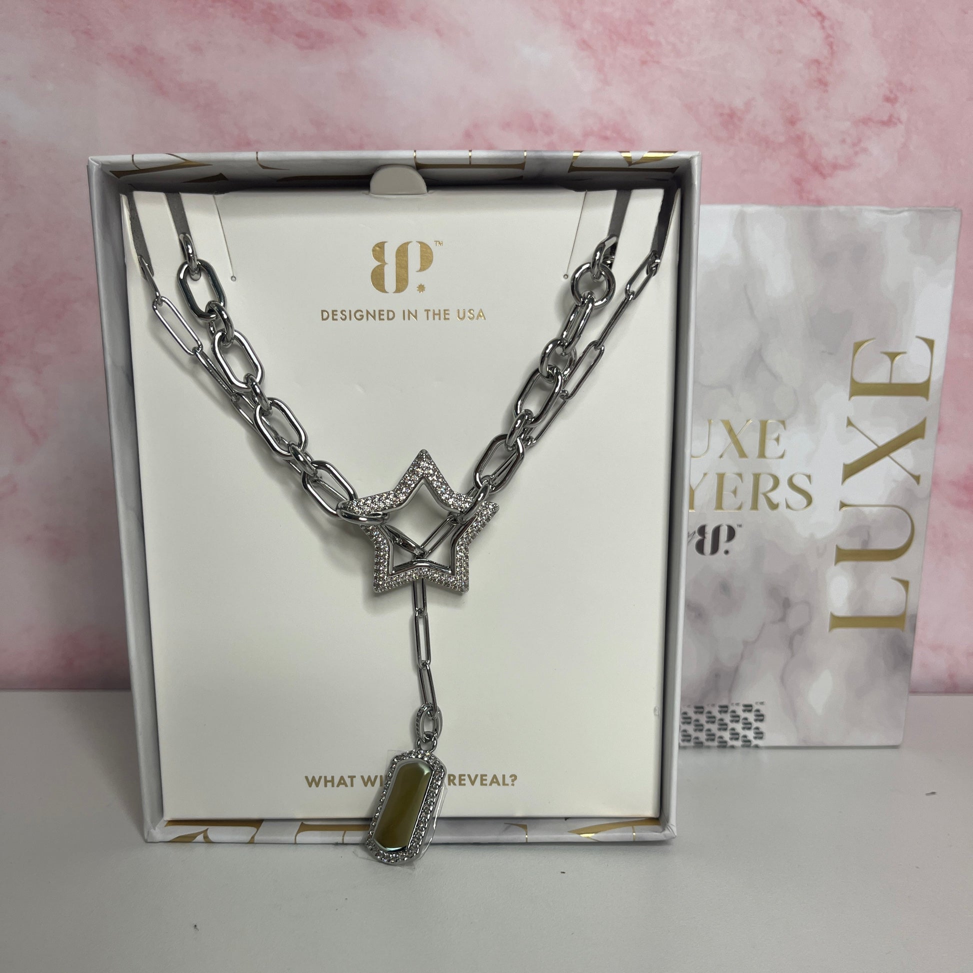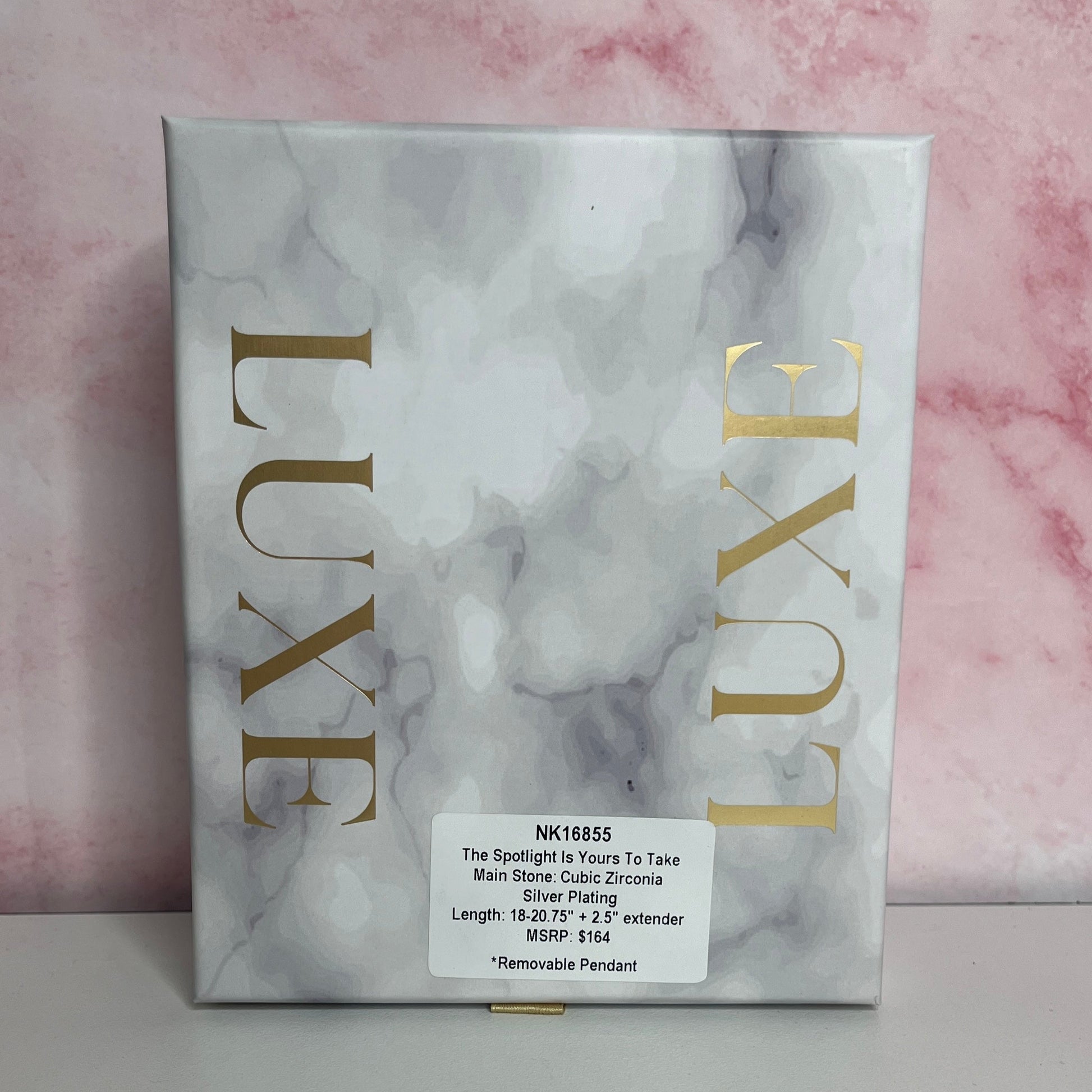 Highly-sought after Luxe Layer 2025 necklace. Main stone Diamond cubic zirconia on Rhodium Plating.Β